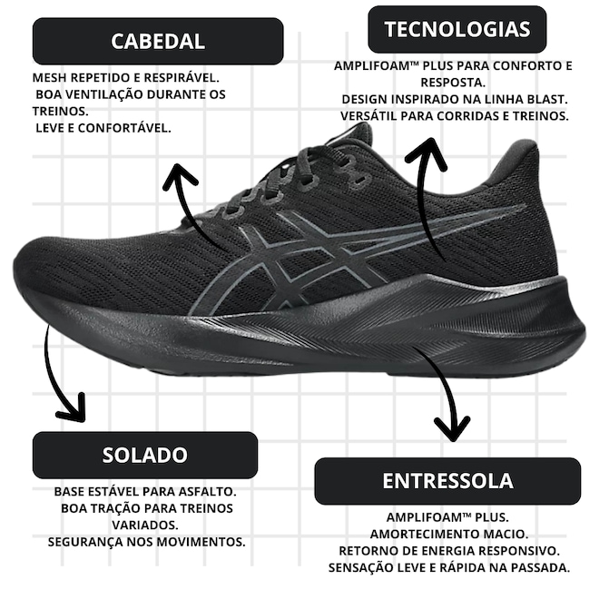 - Cabedal em mesh: Ajuda a proporcionar boa respirabilidade.