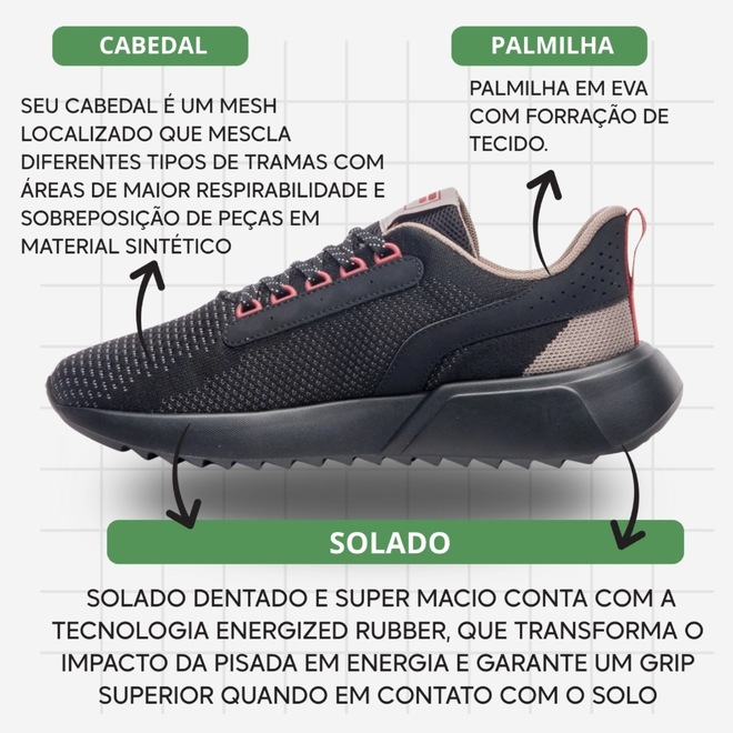 -ENERGIZED RUBBER: tecnologia aplicada ao solado que transforma o impacto da pisada em energia e oferece grip superior.