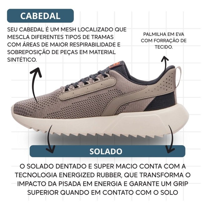 -ENERGIZED RUBBER: tecnologia aplicada ao solado que transforma o impacto da pisada em energia e oferece grip superior.