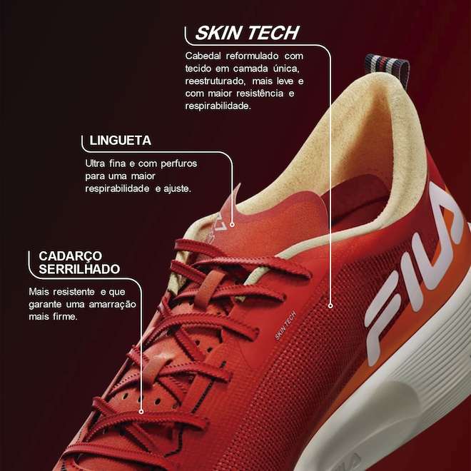 Skin Tech: Materiais avançados como uma segunda pele que vestem o pé com máxima precisão e excelente respirabilidade para eficiência na performance.Drop (Altura entre o calcanhar e a parte frontal do pé): 6 mm
