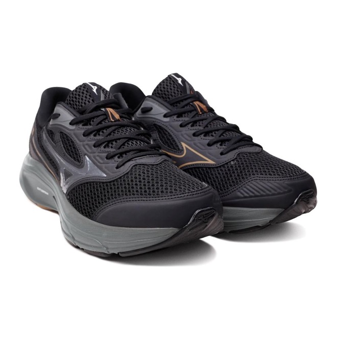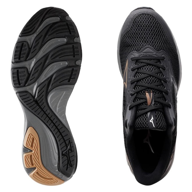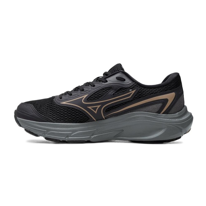Logo da Mizuno, símbolo de qualidade e performance, está presente no cabedal e na palmilha.