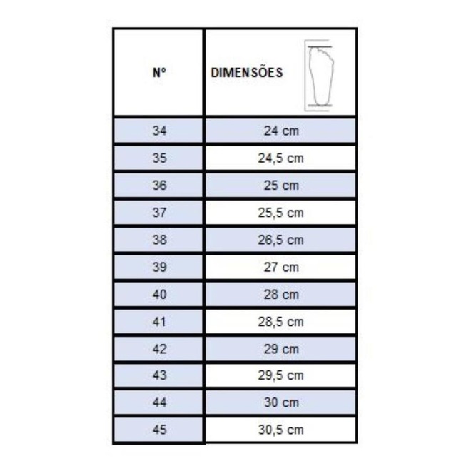 Recomendações de Uso: A limpeza do calçado pode ser feita com sabão neutro e pano úmido.Não deixar de molho e não utilizar nenhuma fonte de calor para secar.