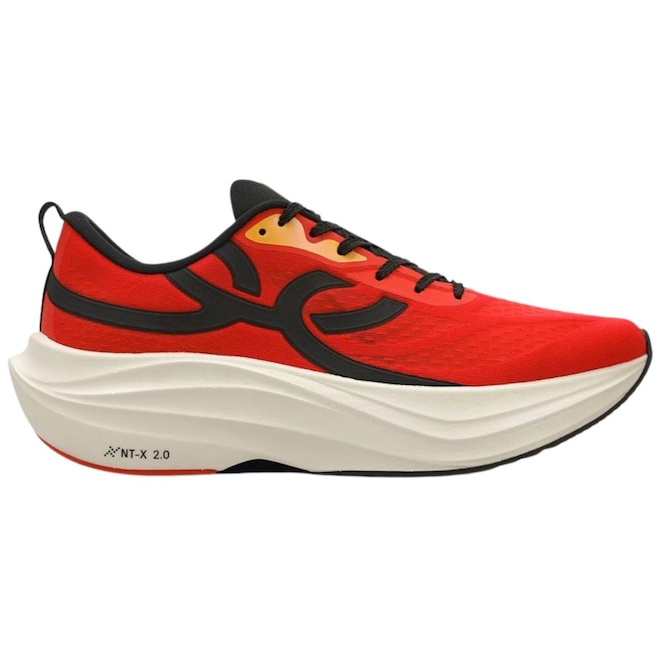 NT-X 2.0 - Entressola em TPEE expandido com nitrogênio (SCF), proporcionando nível máximo de amortecimento, grande retorno de energia, alta resiliência e baixa deformação ao calçado, aind conta com extrema leveza