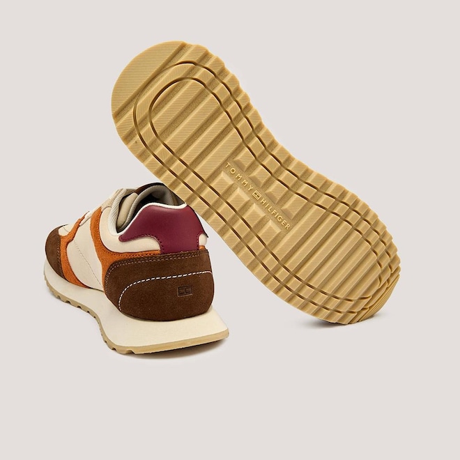 O Tênis Tommy Hilfiger New Runner EVA Mix Classic traz o equilíbrio perfeito entre estilo retrô e conforto moderno. Produzido em 100% suede, o modelo apresenta um visual sofisticado com sobreposições em tons terrosos marrom, caramelo e bege que criam um contraste elegante e atemporal. O design é complementado pelo detalhe em vinho no calcanhar e pelo logo Tommy Hilfiger sutilmente gravado na lateral.