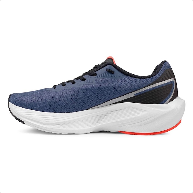 O grande destaque fica por conta da entressola com tecnologia Charged Cushioning, que oferece amortecimento responsivo, absorvendo impactos e devolvendo energia a cada passada, favorecendo a performance em diferentes ritmos e terrenos.