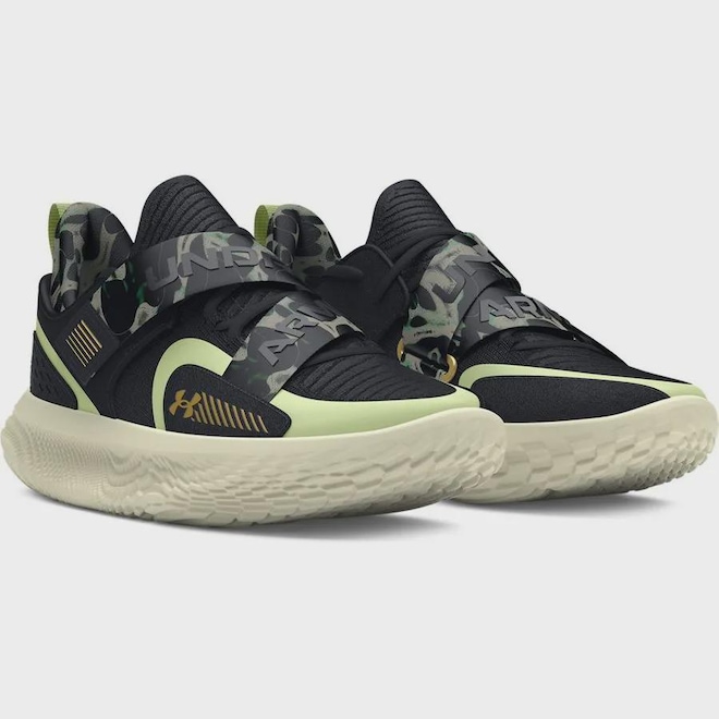 Cabedal respirável com tecnologia UA IntelliKnit proporciona maior conforto com elasticidade e suporte onde você precisa. Faixa ajustável para um calce superior e firme. Aplicações de TPU e couro sintético fornecem suporte e estabilidade com leveza. Cabedal: 65% Têxtil e 35% Sintético. SOLA: 100% Etileno Vinil Acetato (EVA).