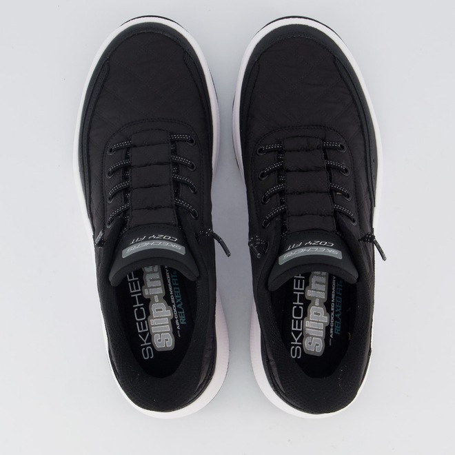 Hands Free Slip-ins®: Tecnologia de calce sem esforço que permite colocar o tênis sem usar as mãos, com estrutura que facilita a entrada e saída com total praticidade. Heel Pillow®: Estrutura exclusiva no calcanhar que mantém o pé firme e seguro dentro do tênis, garantindo estabilidade e conforto ao longo do dia. Cozy Fit®: Cabedal em materiais premium macios e acolchoados que envolvem os pés com conforto luxuoso, proporcionando ajuste natural e suave. Contour Foam™: Entressola superleve que se adapta ao formato único do pé, suavizando cada passada com amortecimento personalizado. Air-Cooled Memory Foam®: Palmilha com espuma de memória ventilada que alivia a pressão, oferece conforto instantâneo e respirabilidade interna. Relaxed Fit®: Design com espaço adicional na ponta e antepé, ideal para quem prefere um ajuste mais amplo e confortável. Composição cabedal (parte superior): Produzido em material têxtil com partes em sintético Forro: Material têxtil com leve acolchoamento Palmilha: Moldada e forrada Solado: EVA macio, colado com partes em borracha Entresola: EVA leve e macio Indicado para: Caminhada e casual Lingueta: Macia e flexível Cor predominante: Preta Altura da Sola: 4 cm Gênero: Masculino Origem: Importada Peso aproximado: 620g o par n° 40
