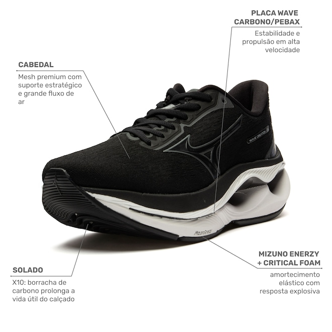 A espuma sustentável Mizuno Enerzy oferece maciez e excelente retorno de energia, enquanto o solado X10™, com borracha e carbono, amplia a tração e a durabilidade.