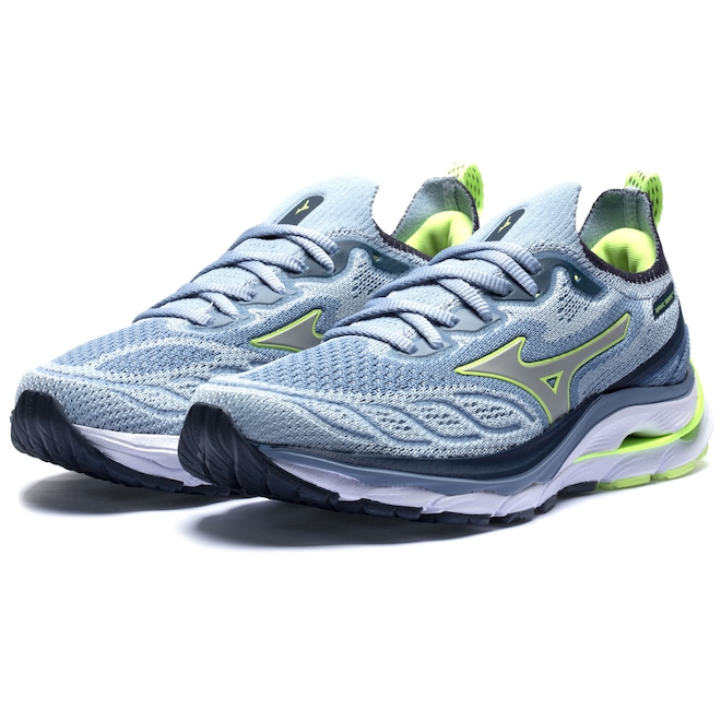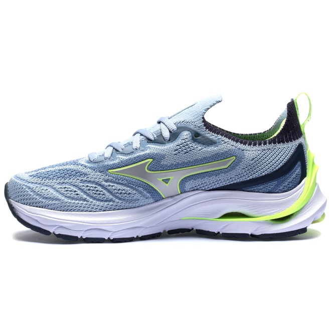 Na entressola: Mizuno Wave®: Nova geração da tecnologia Wave, que garante a efetividade inicial de amortecimento do tênis durante 500 km de uso, garantindo 100% da performance do sistema e proporcionando maior dissipação de impactos.