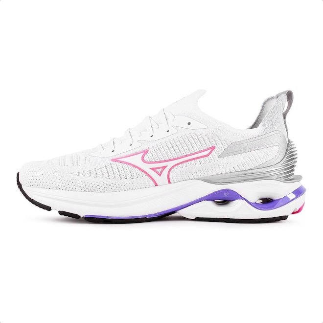 Entressola com tecnologia Mizuno Wave, composta por uma placa ondulada que se estende do calcanhar ao mediopé, proporciona amortecimento responsivo e estabilidade durante a corrida.