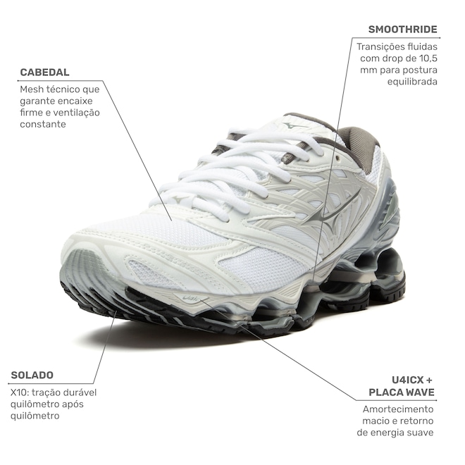 Com o icônico design da linha Prophecy, este modelo traz a tecnologia Mizuno Wave®, que proporciona amortecimento e estabilidade superiores, distribuindo o impacto de forma eficiente.