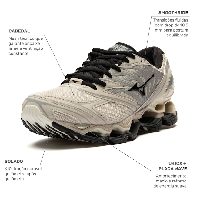 Com o icônico design da linha Prophecy, este modelo traz a tecnologia Mizuno Wave®, que proporciona amortecimento e estabilidade superiores, distribuindo o impacto de forma eficiente.