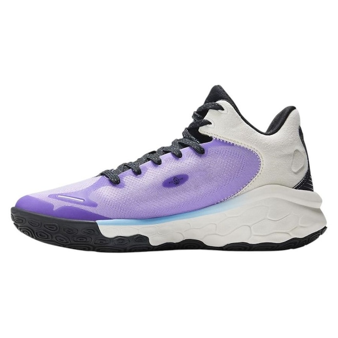 Solado: Borracha com padrão hexagonal espiralado, oferecendo boa tração e aderência em quadra ou ruas/calc¸adas