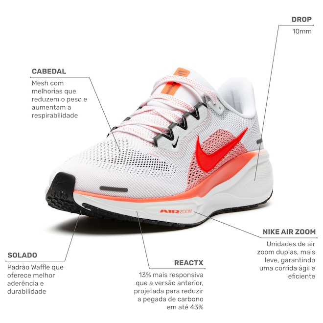 Equipado com a nova tecnologia ReactX, que é 13% mais responsiva que a versão anterior, o Pegasus 41 melhora a eficiência em cada corrida. O solado Waffle de borracha garante aderência superior em diferentes superfícies, proporcionando segurança e durabilidade.