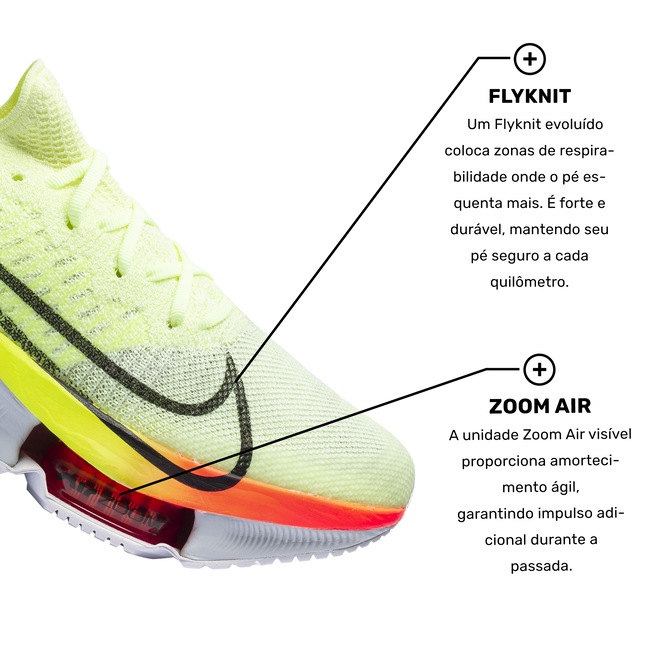 Nike Zoom Air: Permite resposta rápida de movimentos com mais leveza, oferecendo proteção contra impactos, maior estabilidade e sensação de baixo perfil.