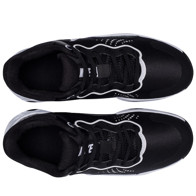 O cabedal (parte superior do calçado) em sintético e têxtil, com entressola em EVA e solado de borracha, com ponto de giro.