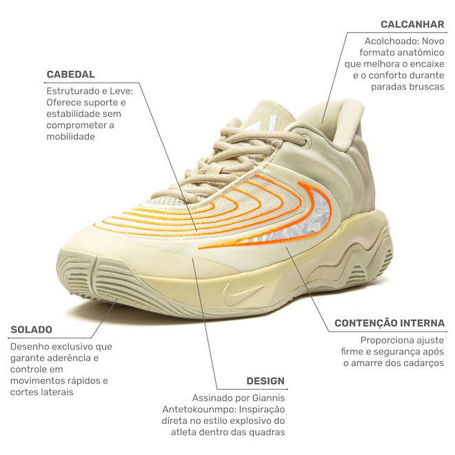 Atualizamos o padrão de tração para os padrões de Giannis, dando a você e ao Greek Freak melhor sensação na quadra e mobilidade ao cortar e se mover em altas velocidades.