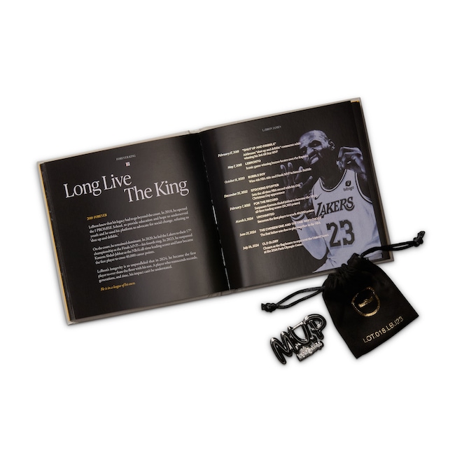 O tênis certo tem tudo a ver com LeBron, com seu dourado característico, além do ícone “Chosen 1” no calcanhar, uma homenagem à sua carreira histórica. O pé esquerdo preto e roxo homenageia Bronny com seu próprio decalque no calcanhar "1 Who Chose", simbolizando seu caminho individual no jogo. O padrão do cabedal de ambos os tênis é uma mistura de coroas grandes (saudando o longo reinado de LeBron) e coroas pequenas (simbolizando a promessa de Bronny).
