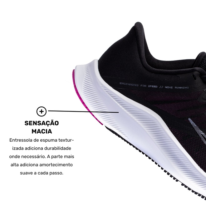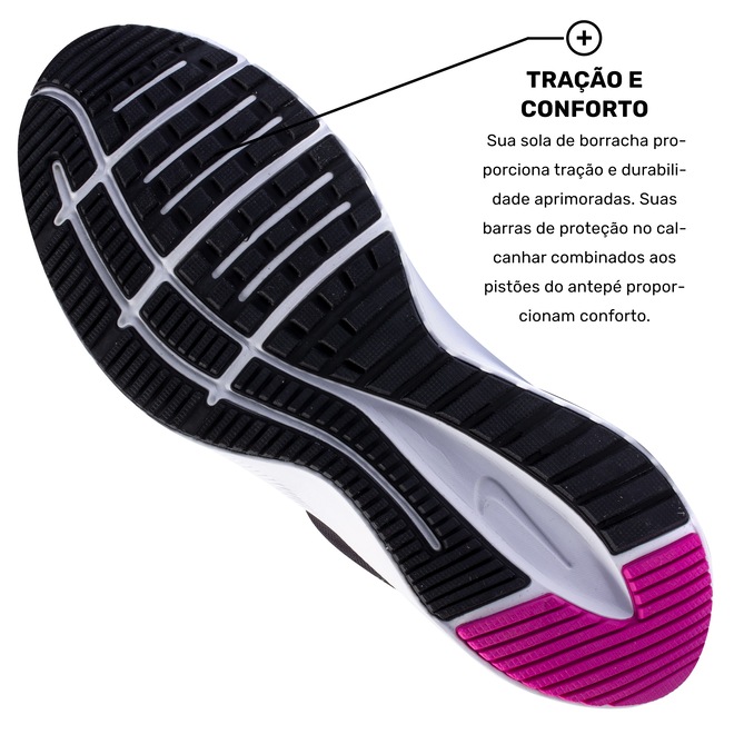 Já a entressola em espuma oferece amortecimento na medida certa dando ótima responsividade nas passadas. solado emborrachado mantém a aderência necessária na superfície com ranhuras que ajudam na flexibilidade dos movimentos.