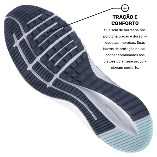 O solado em borracha que contribui para aderência e tração em todas as superfícies.