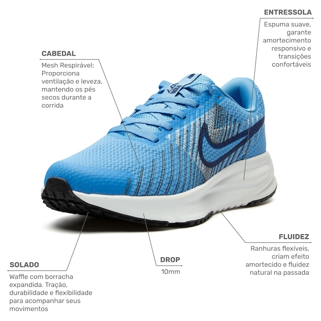 Com design moderno e estrutura que favorece a movimentação natural dos pés, o Nike Run Defy é ideal para quem busca performance com um visual esportivo e elegante.
