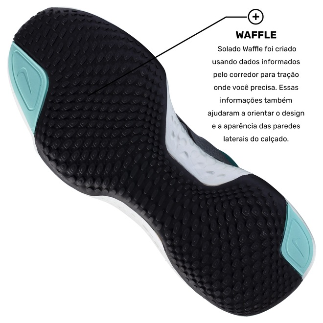 Solado Waffle: Durável, utiliza formas amplas, profundas e ampliadas no antepé para proporcionar excelente tração multi superfícies, além de propulsionar o atleta para frente.