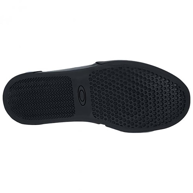Tênis Oakley com cabedal em material não natural e tecido, forro em tecido que absorve umidade, solado em borracha de alta tração, resistência e abrasão e palmilha perfurada que proporciona conforto e respirabilidade.