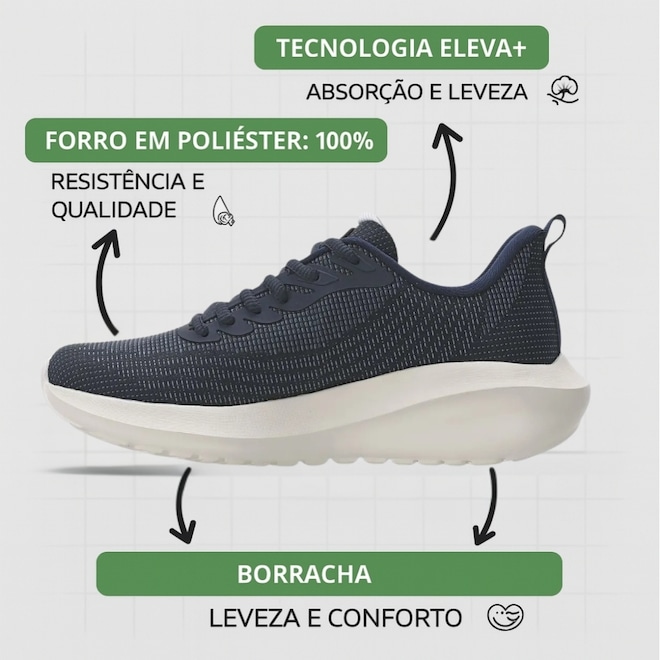 -ELEVA+: Espuma de alta performance desenvolvida para garantir máxima resposta, amortecimento eficiente e um efeito trampolim a cada passada, promovendo mais impulso e conforto.