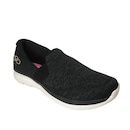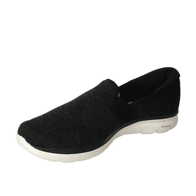 O cabedal é têxtil, estilo slip-on, com tiras elásticas nas laterais para ajuste personalizado e maior suporte.