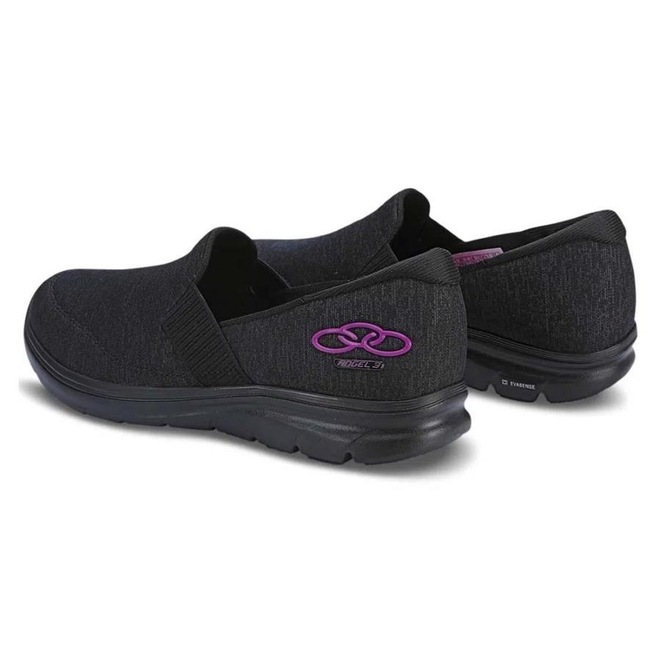O cabedal é têxtil, estilo slip-on, com tiras elásticas nas laterais para ajuste personalizado e maior suporte.