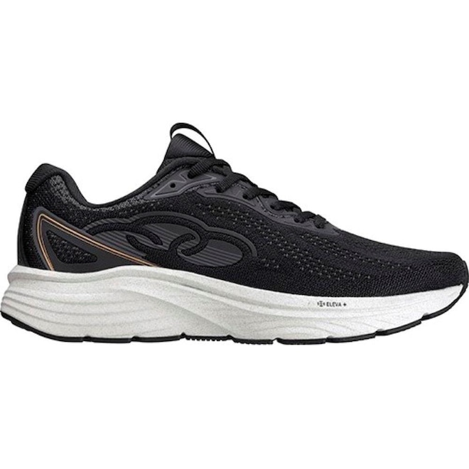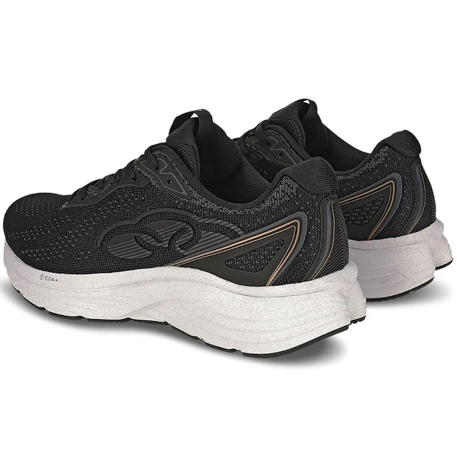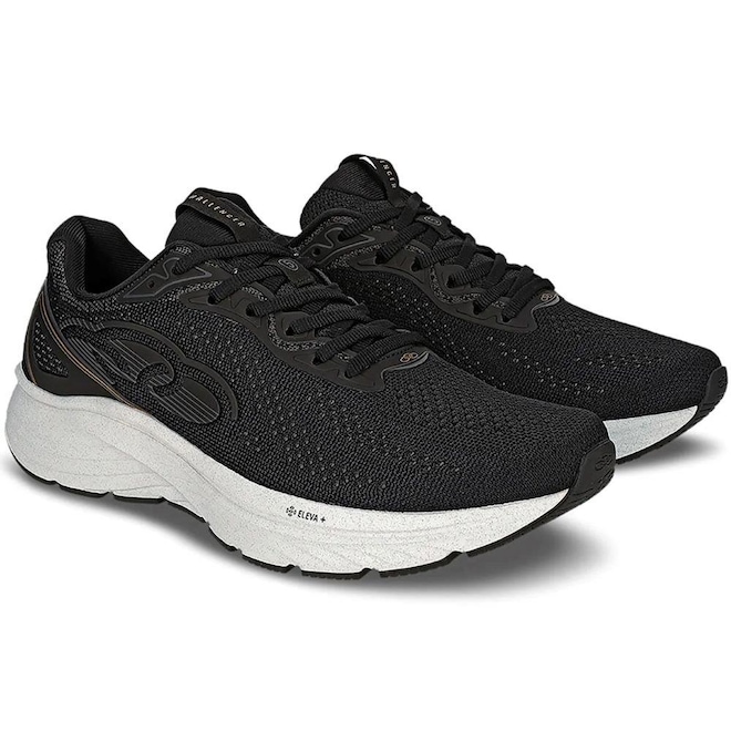 a tecnologia Eleva+ para conforto e amortecimento, proporcionando o efeito trampolim, e sua sola apresenta conforto e resiliência, com
