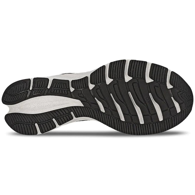 desenho curvilíneo com pontos de contato distribuídos em seções favorecem a flexão e aderência do tênis. A parte superior apresenta