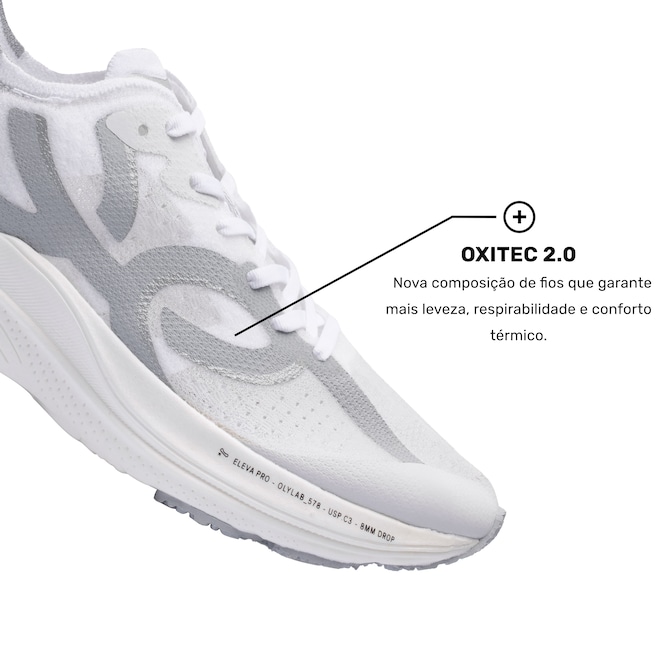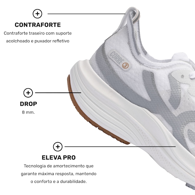A entressola com drop 8 mm apresenta a tecnologia de amortecimento Eleva Pro que garante máxima resposta para manter o conforto e uma melhor performance.