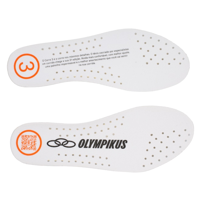 Sua palmilha é em EVA plana e forrada com furos para respirabilidade e QR Code que te direciona para uma página exclusiva com todas as informações do produto.