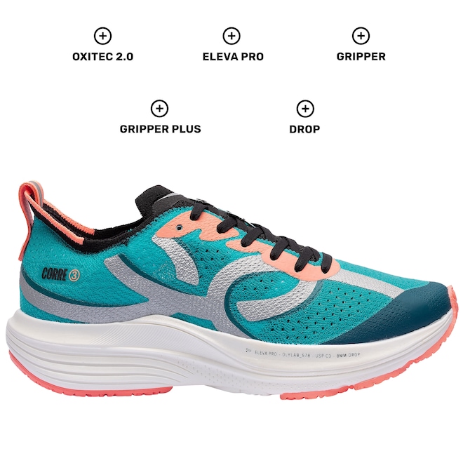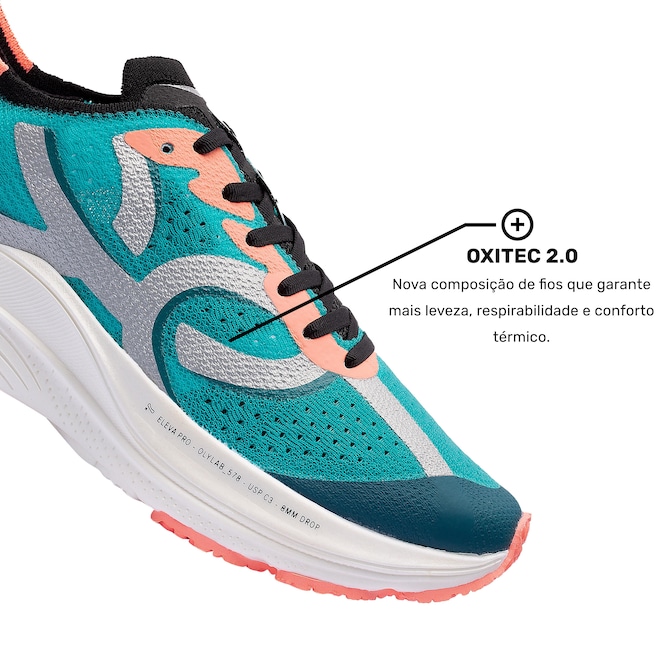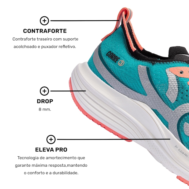 A entressola com drop 8 mm apresenta a tecnologia de amortecimento Eleva Pro que garante máxima resposta para manter o conforto e uma melhor performance.