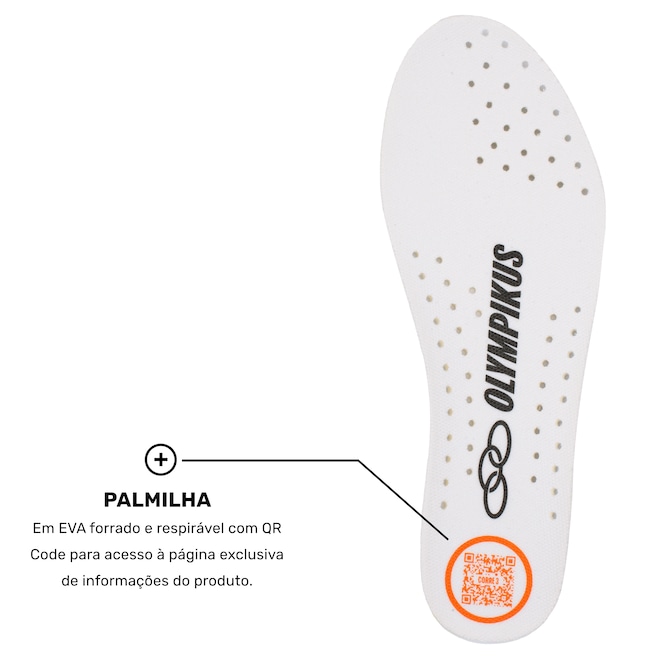 Sua palmilha é em EVA plana e forrada com furos para respirabilidade e QR Code que te direciona para uma página exclusiva com todas as informações do produto.