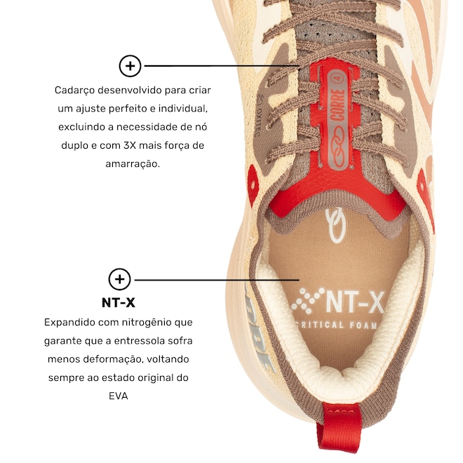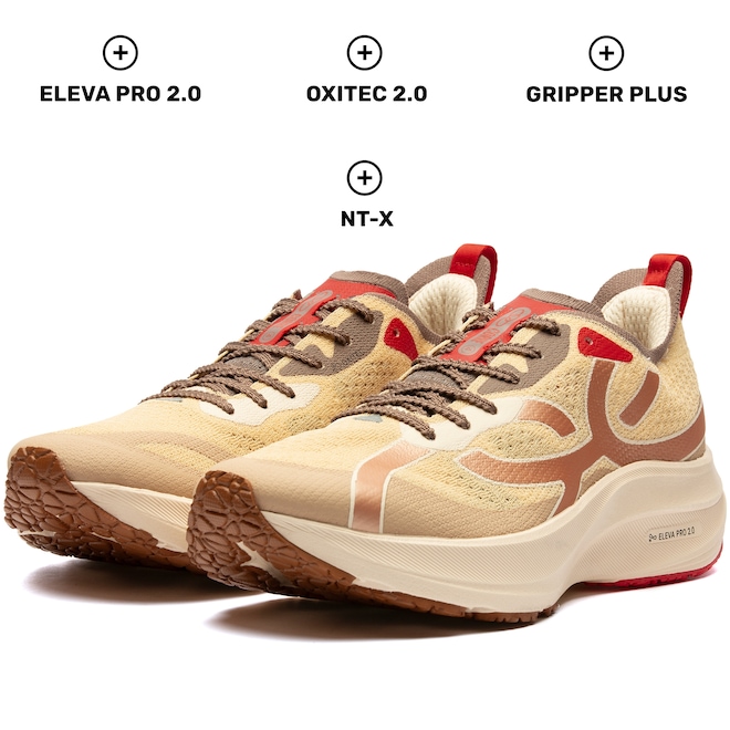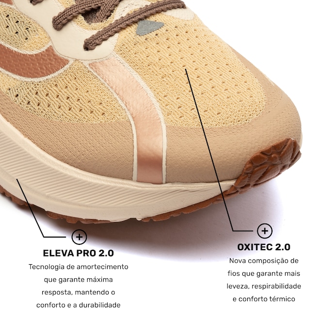 Com cabedal em mesh e tecnologia Oxitex 2.0, ele oferece ajuste firme e excelente respirabilidade, mantendo os pés confortáveis durante treinos intensos. A entressola em EVA, com a inovadora tecnologia NT-X, proporciona um retorno de energia eficaz e durabilidade prolongada. Já a tecnologia ELEVA PRO garante uma passada responsiva, maximizando o desempenho.