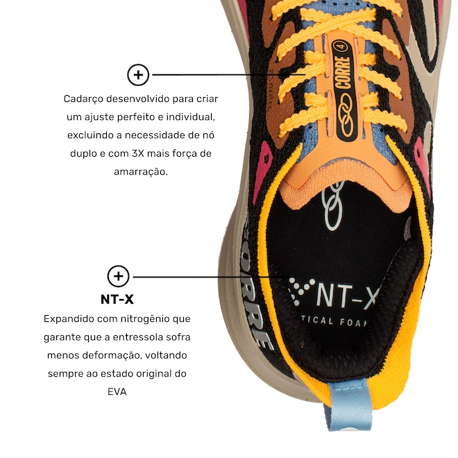 Já a entressola com NT-X, expandida com nitrogênio, garante que o EVA sofra menos deformação, voltando ao seu estado original após cada uso, prolongando a vida útil do tênis e proporcionando uma sensação de novo por mais tempo.