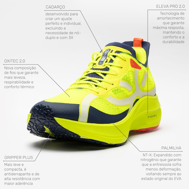 Para ainda mais leveza e respirabilidade, o cabedal traz a tecnologia OXITEC 2.0, uma composição de fios com monofilamento, elastano e poliéster, que oferece conforto térmico superior.