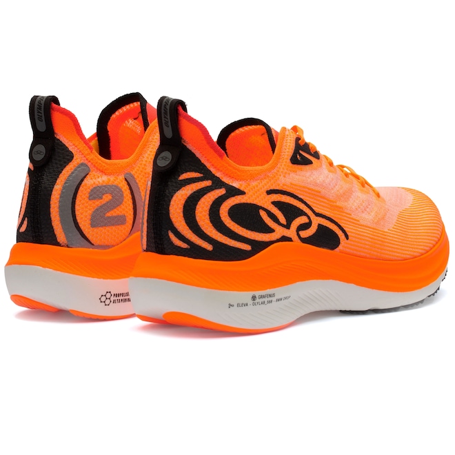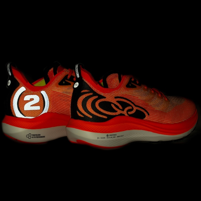 Com drop 8mm, na parte interna da entressola, a placa de Grafeno com tecnologia Grafenus repaginada anatomicamente possui 1.8mm de espessura, ainda mais rígida, que garante um combo de propulsão, retorno de energia e efeito trampolim.