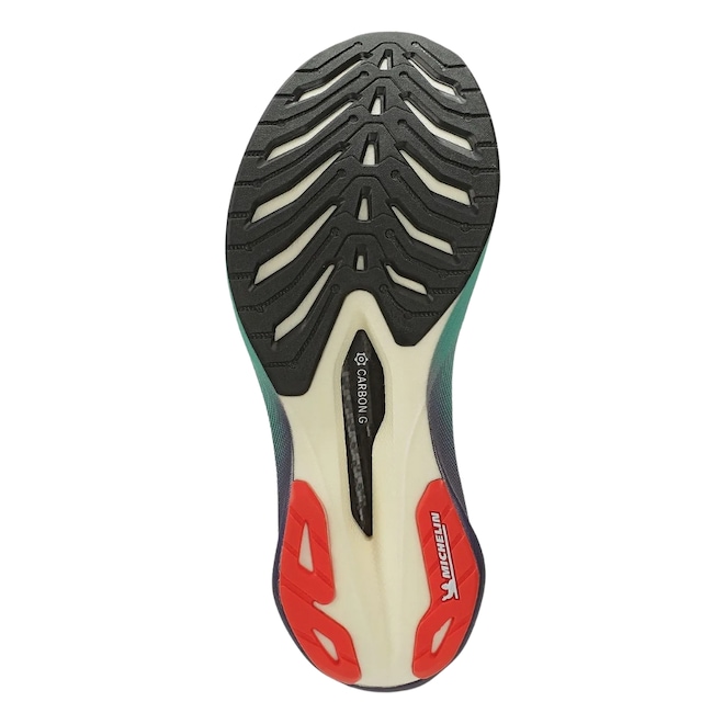 Composição: Cabedal: Gáspea (têxtil); Lingueta: Eco-suede; Entressola: PEBA e placa de carbono; Solado: Borracha