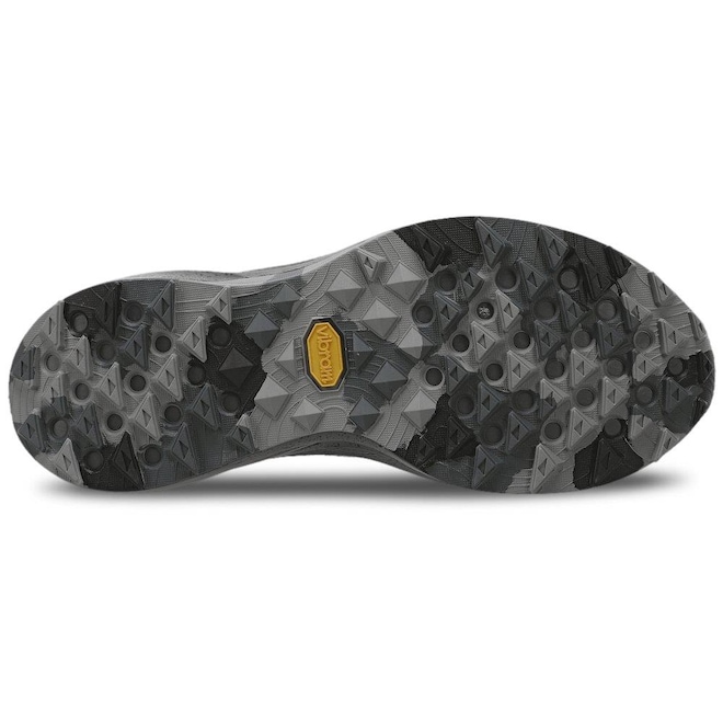 O solado com Vibram® fornece tração máxima, durabilidade e resistência, adaptando-se a diferentes superfícies e condições.