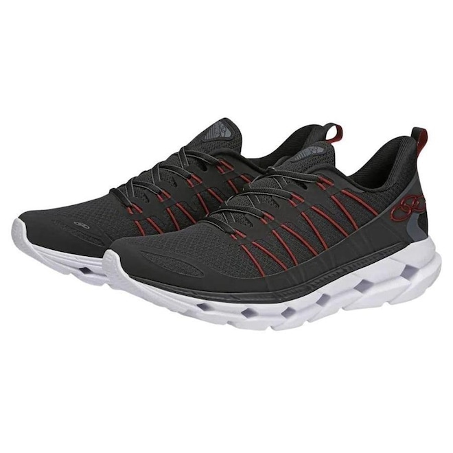 Possui estrutura em tecido de dupla frontura respirável, reforço acolchoado no colar do calcanhar para diminuir o desconforto do atrito de contato e cadarço reforçado por fios de tensão.