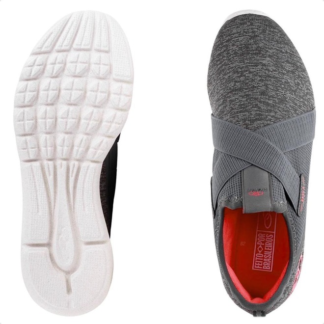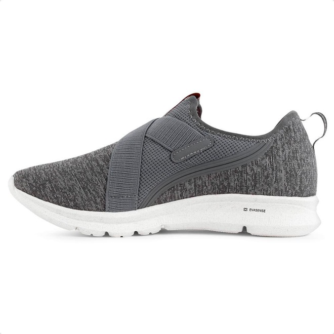 Ainda conta com lingueta integrada e modelagem Slip-On, facilitando o calçar, o contraforte tem suporte acolchoado e a palmilha é macia.