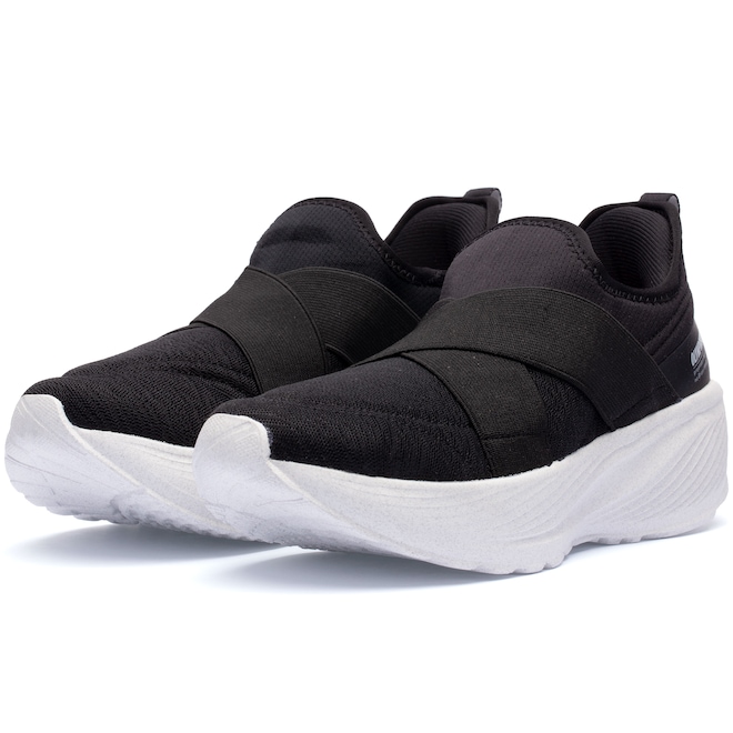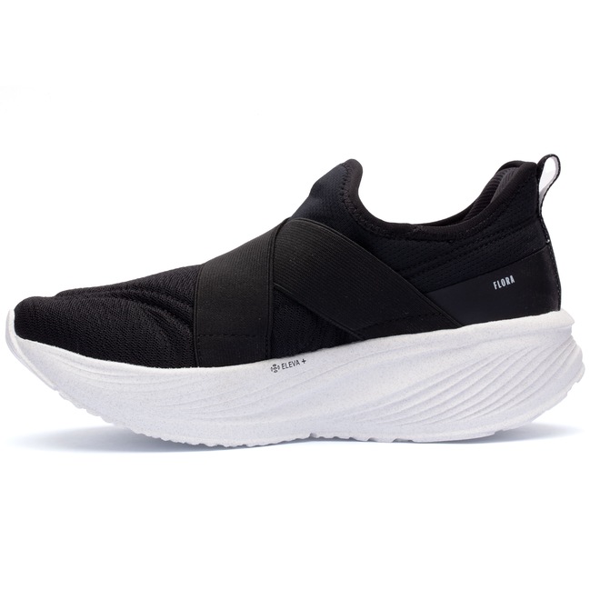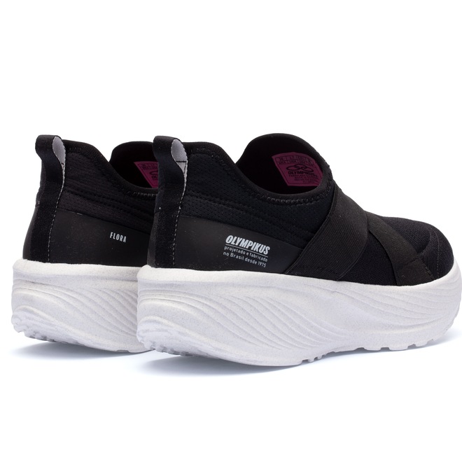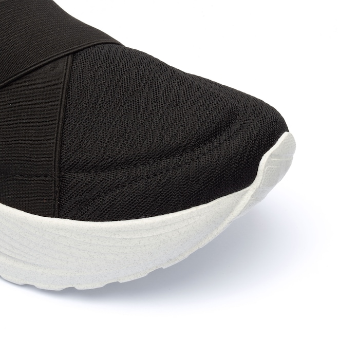 O design é slip-on, sem cadarço, facilitando o calce com praticidade e conforto em material têxtil e tira elástica para suporte e apoio.