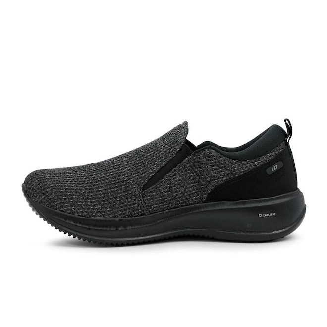 Seu cabedal (parte superior do tênis) é slip-on, sem cadarço, em tecido bicolor para um encaixe prático e rápido.