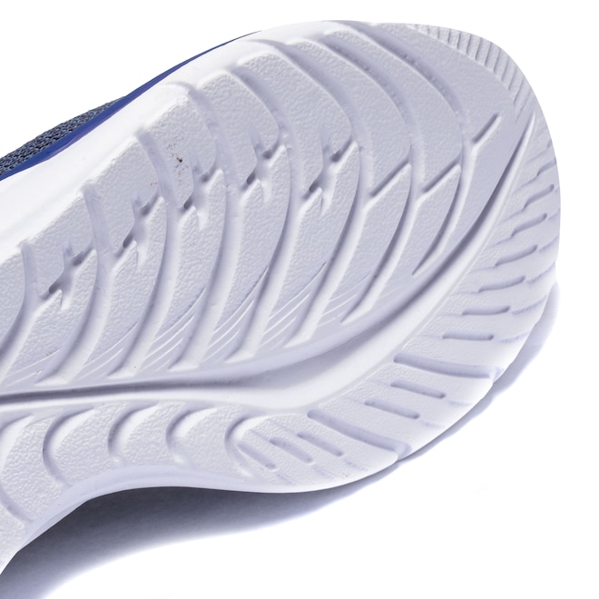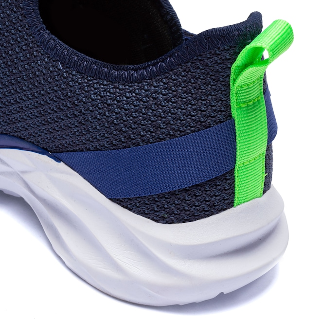 O cabedal (parte superior do tênis) é têxtil sem cadarço com pequena abertura lateral ajustada por tira em velcro para faciltar o encaixe.