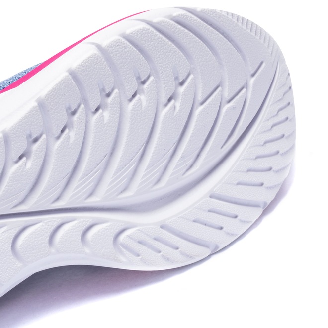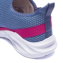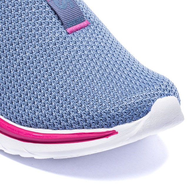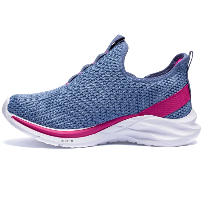 O cabedal (parte superior do tênis) é têxtil sem cadarço com pequena abertura lateral ajustada por tira em velcro para faciltar o encaixe.