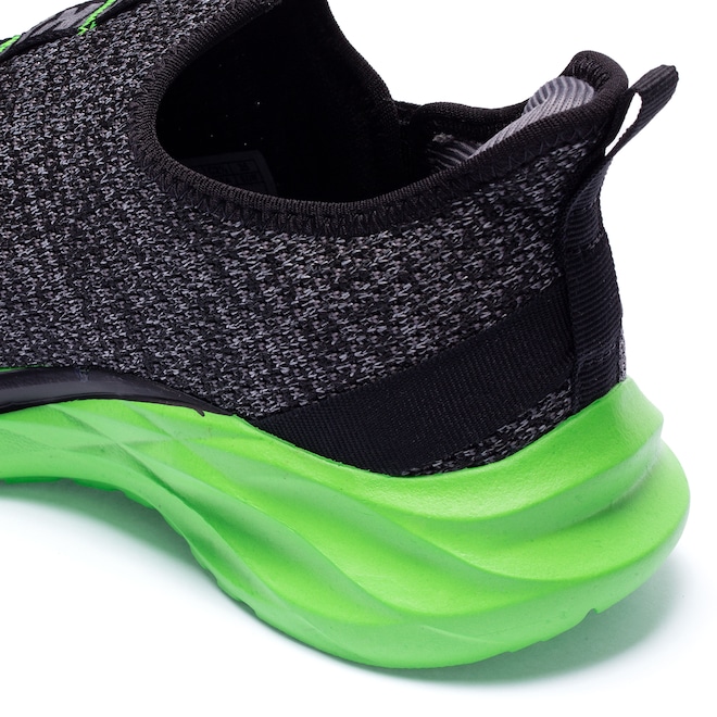 O cabedal (parte superior do calçado) é em material têxtil, lingueta integrada e palmilha removível.