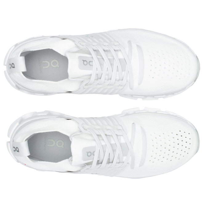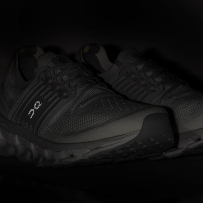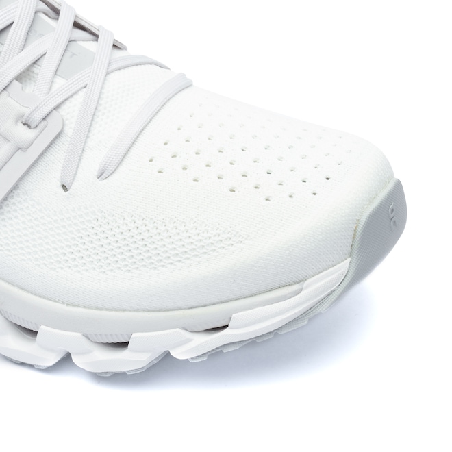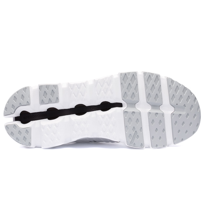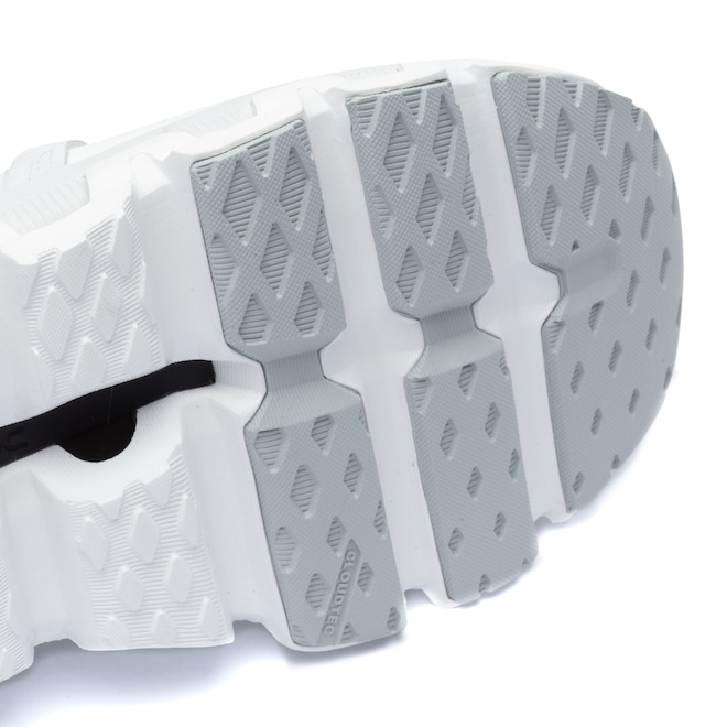 O cabedal, inspirado na engenharia suíça, é em malha leve e respirável de conteúdo reciclado com lingueta integrada e detalhe lateral para abraçar o pé como se fosse uma meia com mais suporte. No contraforte, o suporte acolchoado ajuda a diminuir o desconforto do atrito de contato.